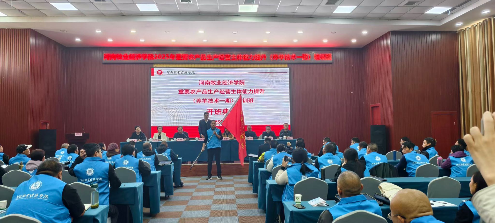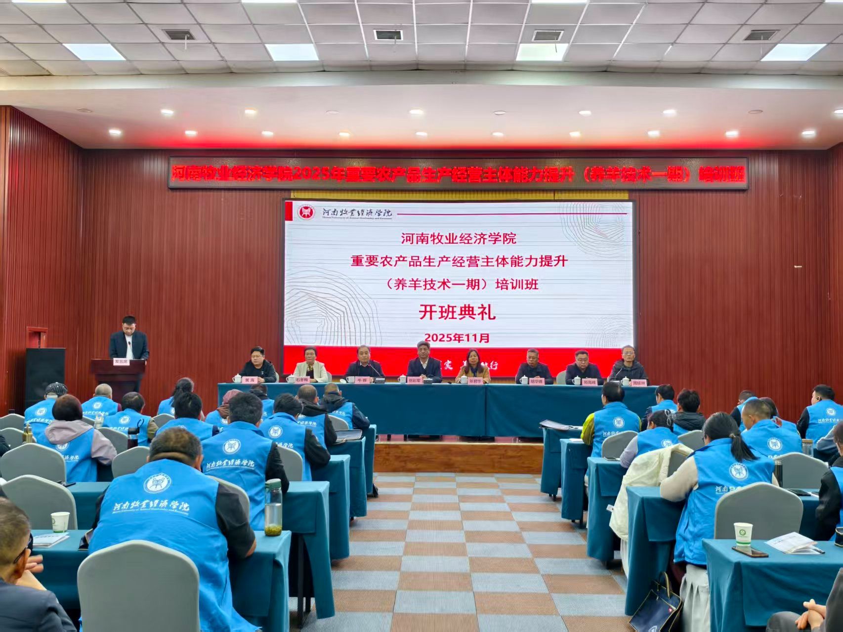 11月5日下午,由beat365承办的2025年高素质农民培育(养羊技术一期)培训班开班典礼在河南现代农业研究基地报告厅举行。副校长岳彩军、社会服务办公室主任胡华锋、beat365在线唯一官网登录党总支书记张君华、院长牛晖、副院长周延州等相关同志及接受培训的全体学员参加了开班典礼。开班典礼由beat365在线唯一官网登录院长牛晖主持。