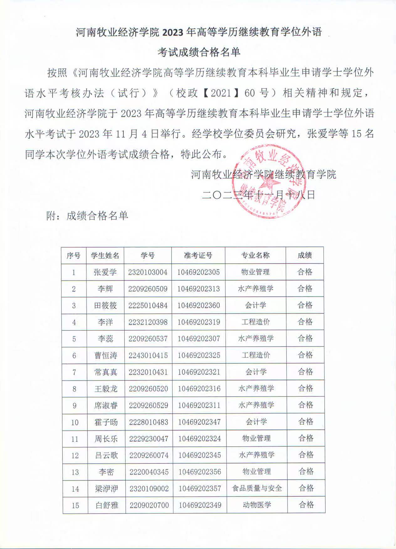 beat365在线唯一官网登录2023年高等学历继续教育学位外语考试成绩合格名单