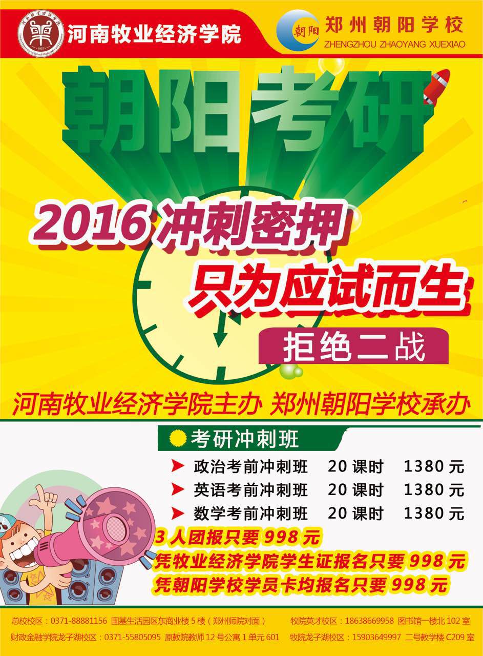 根据部分师生要求,经过深入调研,学校决定与郑州朝阳学校联合举办硕士研究生考前辅导班,现将相关事宜通知如下: